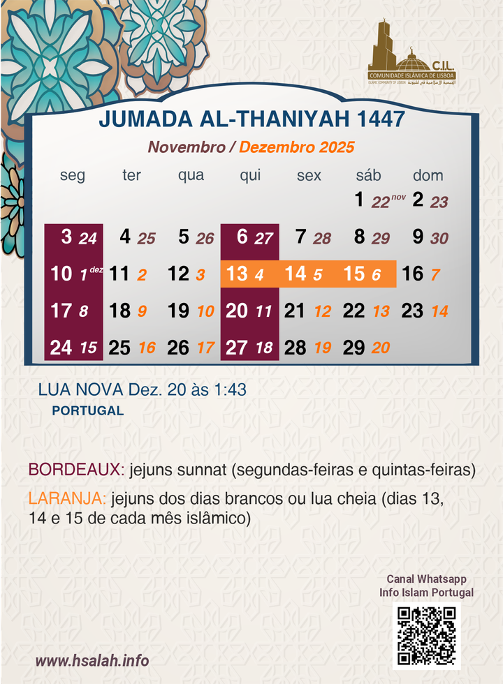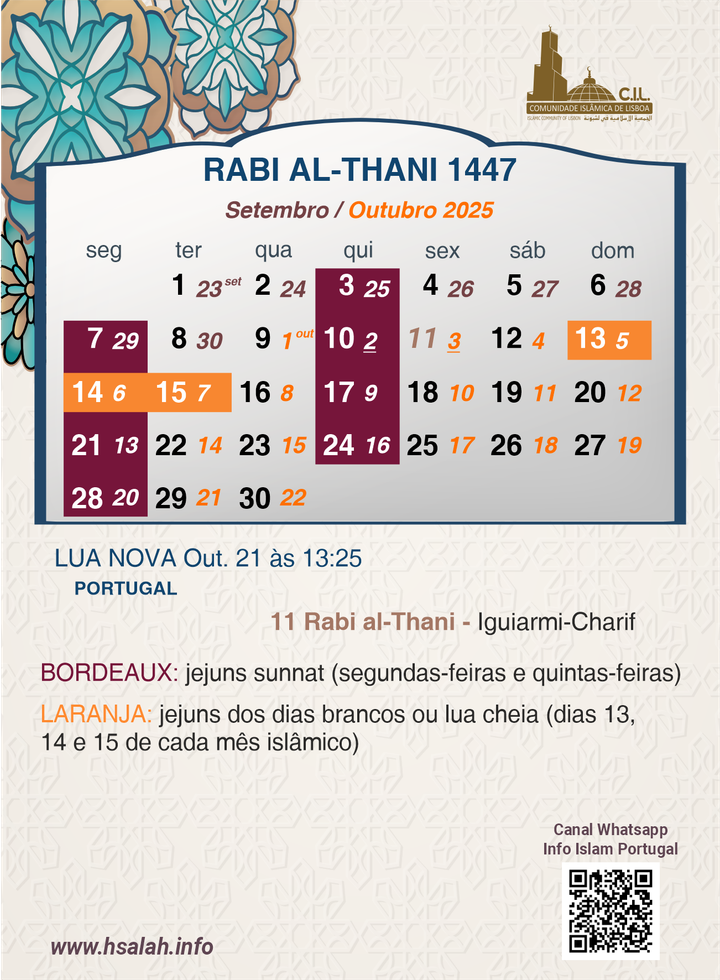 Horários calculados com base em dados astronómicos e verificados pela CIL - Comunidade Islâmica de Lisboa.